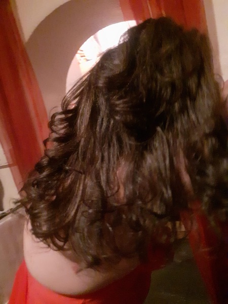 Haare:dunkelbraun, schulterlang, gelockt
